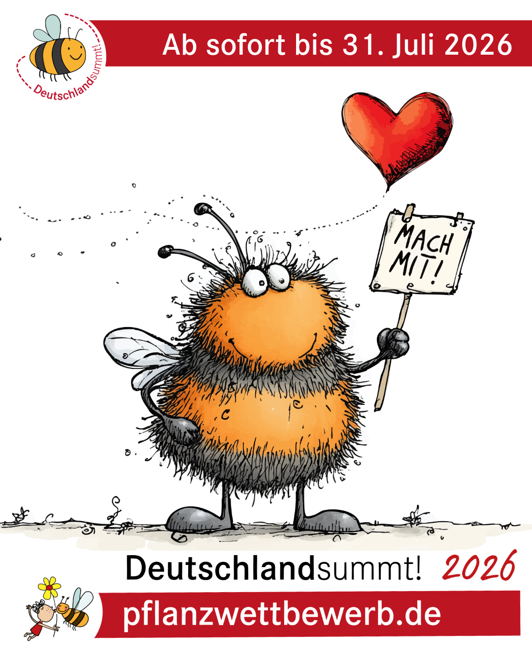 Ganz gleich, ob im eigenen Garten, auf dem Balkon, mit der Schulklasse, im Unternehmen oder gemeinsam mit der Nachbarschaft: Mitmachen ist mit fast jeder Fläche möglich. Der Wettbewerb läuft vom 1. April bis 31. Juli. Alle Infos unter: wir-tun-was-fuer-bienen.de