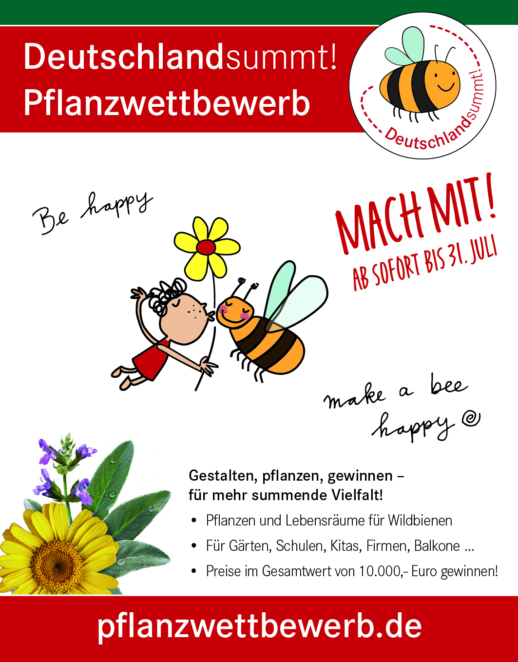 Ganz gleich, ob im eigenen Garten, auf dem Balkon, mit der Schulklasse, im Unternehmen oder gemeinsam mit der Nachbarschaft: Mitmachen ist mit fast jeder Fläche möglich. Der Wettbewerb läuft vom 1. April bis 31. Juli. Alle Infos unter: wir-tun-was-fuer-bienen.de