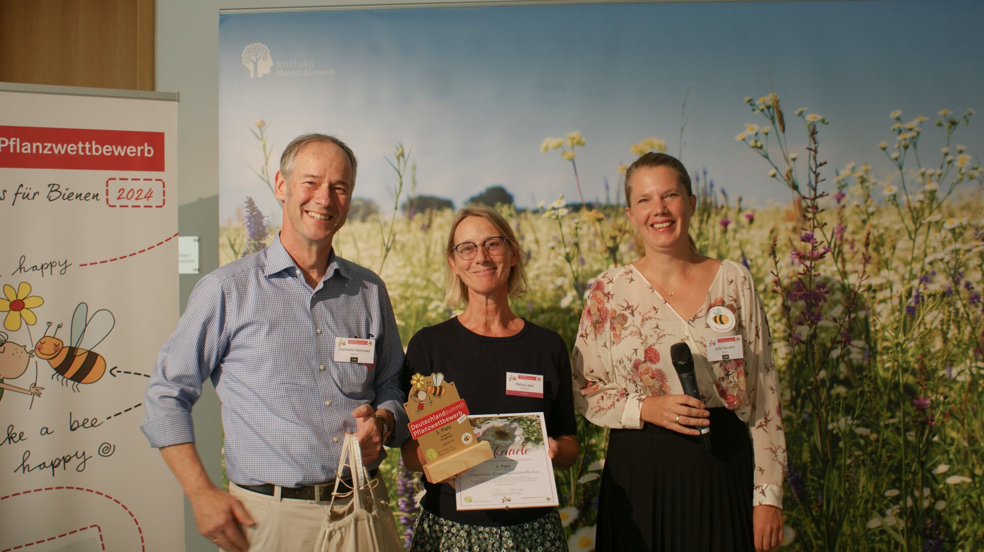 Bild 7: Die Stiftungsleitung (li.+re.) ehrt eine Gewinnerin (3. Platz) in der Kategorie „Firmengärten“. © Stiftung für Mensch und Umwelt/Peter Müller -